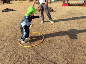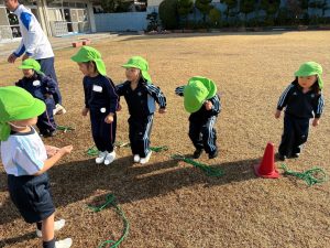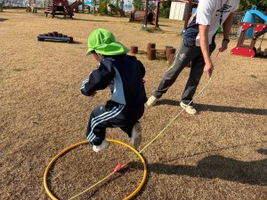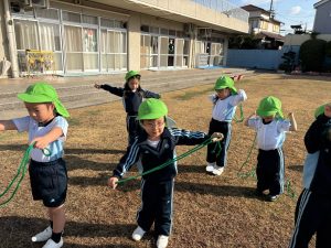 先日の体操では、縄跳びが始まりました。縄になれるために、様々な活動を行いました。まず、縄を1/4に折った状態で前、後ろと跳び越えました。縄跳びを伸ばして、おさんぽもしました。1本の状態でぐるぐる回しもました。最後に大縄跳びを飛んでみました。フラフープからはみ出さないようにジャンプをし、縄が来たタイミングで跳びました。楽しい体操の時間を過ごすことができ、子どもたちの笑顔がたくさん見られ、「またつぎもなわとびしたい!」とお話してくれた年少組の子どもたちでした。