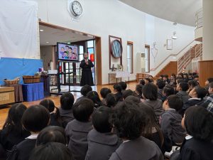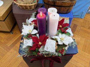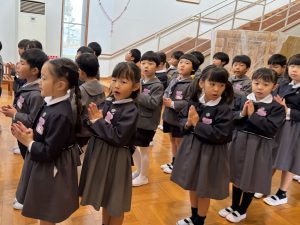 クリスマス(イエス様の誕生日)を迎えるための心の準備期間、待降節が始まりました。待降節1週目は「すべてのものに感謝」というテーマで過ごします。全園児がホールに集まり、シスターが感謝についてのお話をしてくださいました。「野菜やお米を育ててくれている方がいるから美味しいごはんが食べられること」「虫や花、植物にとっては雨も晴れもありがたいことだということ」「幼稚園で毎日友だちや先生に会えること」「イエス様、マリア様がいつもみんなのことを見守ってくださっていること」すべてのことに感謝しましょうというお話を聞き、待降節1週目の紫のろうそくに火を灯しました。これから4週間、優しい気持ちでイエス様の誕生を迎えられるよう子どもたちと準備していきたいと思います。