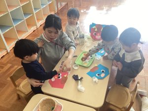 もうすぐ、節分。めばえ組さんでは、オニのパンツの製作をしました。絵の具が楽しくダイナミックに手を動かすお友達や慎重にゆっくり手を動かし大きな丸を描くお友達など、個性豊かなパンツが出来上がりました✨😊
