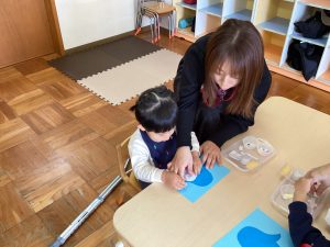 もうすぐ、節分。めばえ組さんでは、オニのパンツの製作をしました。絵の具が楽しくダイナミックに手を動かすお友達や慎重にゆっくり手を動かし大きな丸を描くお友達など、個性豊かなパンツが出来上がりました✨😊
