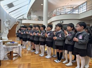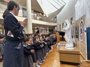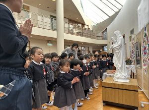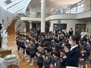 2月3日(火)に聖マリー・リヴィエ帰天祈りの集いが行われました。静寂な雰囲気の中ミサが始まり、園児たちは、聖マリー・リヴィエに御絵と共同祈願を捧げました。