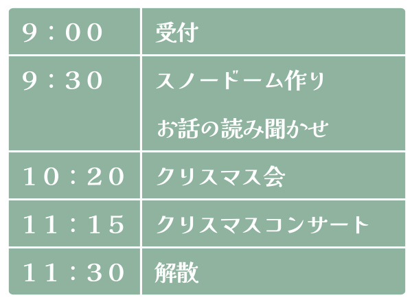 スノードーム作りや、クリスマスのお話の読み聞かせ、楽しいゲームなど盛りだくさん♪