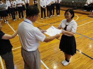 LHRでは前期の成績表、後期レポート等を配布、終業式では英検表彰をしました。