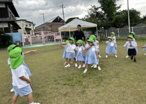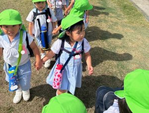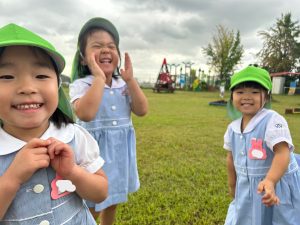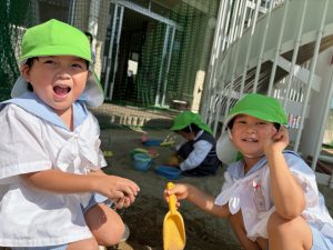 年少組の子どもたちは戸外遊びが大好きです。1学期では、砂場や遊具、乗り物など自分が好きな遊びを見つけ、一人で遊びを楽しんでいたり、時には近くにいるお友だちと一緒に遊んでみたりして過ごしました。2学期になり、簡単なルールのある遊びを楽しんでいます。最近では「だるまさんがころんだ」をクラスみんなで行いました。戸外では、自分の好きな遊びやお芋ほり遠足に向けて、リュックを背負って歩く練習なども行っており、広い園庭で身体をのびのび動かせるよう、年少組みんなで楽しんでいきたいと思います。