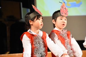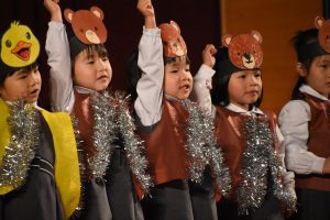 ドキドキワクワクの発表会になりました。集合した時は緊張した表情でしたが、終わってみると「たのしかったー!」とキラキラ笑顔でした。お家の人に飾りつけしていただいたキラキラ衣装と自分の力で塗り絵をしたお面を身に着け、クラスのお友だちといつも一緒に練習しました。今日は衣装を着てするよと伝えると「やったー!!」と目を輝かせながら練習に取り組み始める姿がありました。段階を踏んですすめてきた練習も楽しい気持ちでやり切ることができました。本番当日は、あたたかい拍手をありがとうございました。