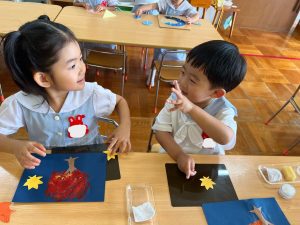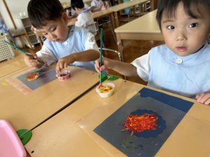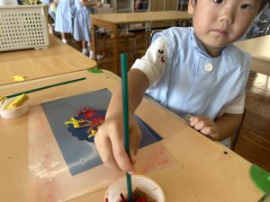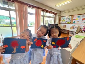 10月のカレンダー製作を行いました。秋の季節になると、葉の色が変わり、紅葉になることを知りました。ストロースタンプで紅葉の葉を表現していきます。木の形になるように、クリアファイルで切り抜きされているのと木の位置とを見て、動かないよう左手で押さえながら、スタンプをしていきます。スタンプが終わり、ファイルをめくると、紅葉の木が出来上がります。子どもたちは、絵具を集中して取り組んでいました。また、ストロースタンプのため、ストローが折れないように力加減を考えながら、押していました。季節のカレンダー製作から、園庭にある木の葉の色が変わるのも楽しみながら、みんなで過ごしていきたいと思います。