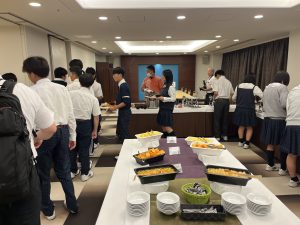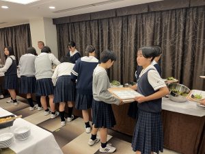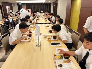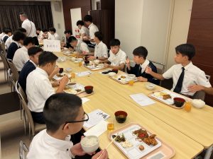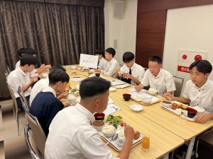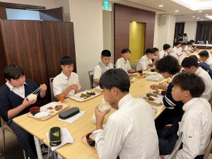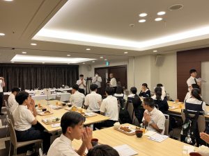 首里城からホテルに戻ってきて、香川くんの食前の祈りののち、みんな楽しくごはんを食べています。