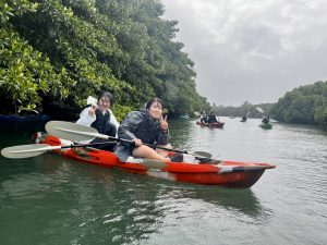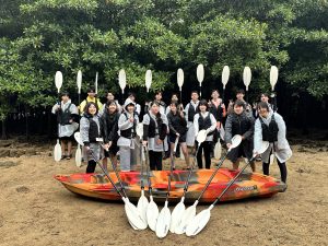 待ちに待ったカヌー体験!風が強かったですが逆風に負けないのが賢明学院の生徒です。