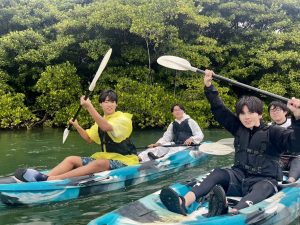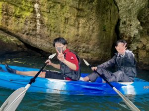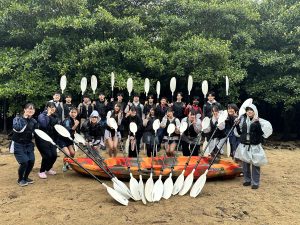 二人一組でパドルを右に左に息を合わせて力強く漕ぎ進めました。