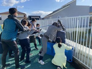 子どもたちは学年で集まり、静かに小さくなって見つからないように避難する練習を行い、教員はさすまたやほうきなど、園内にある身近なものを使い、警察の到着まで不審者が侵入しないよう捉える練習を行いました。
