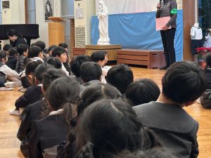警察の方からも、知らない人についていかないこと、知っている人でも一人でついていかないことなど、身の守り方を教えていただき、子どもたちは真剣な表情で聞いていました。