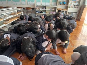 不審者確保の後、ホールに集まり、知らない人が幼稚園に来た時は先生の話をよく聞いて静かに避難するという約束を確認しました。