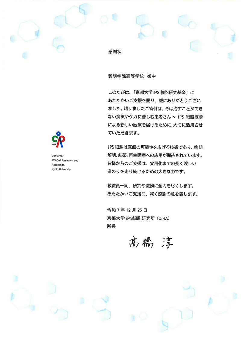 校内外の募金活動を通して、合計45,832円の募金が寄せられ、これらは京都大学iPS細胞研究所へ寄付しました。本校の取り組みに対し、同研究所より感謝状を頂戴しております。