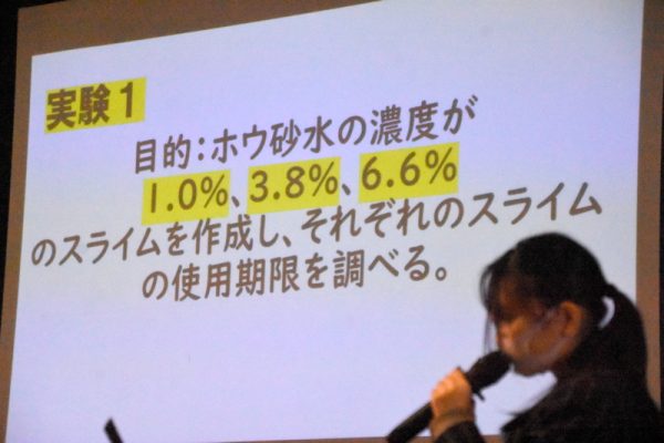 この研究は、スライム作成に必要なホウ砂水の濃度を複数変えて実験と考察を行いましたが、試料作製に10パターン程度、スライム保存期間に要した日数が40日以上と、根気のいる実験に取り組むことができました。