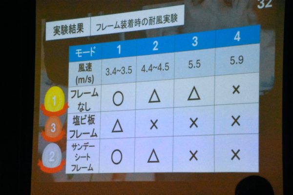 この研究は、ドローンが風を受けても耐えられるようフレームを作るというものでした。残念ながらこの時点で風に耐えうる完璧なフレームを作ることは難しかったようですが、様々な素材によるフレーム作成から角度を微妙に変えてフレームを調整する等、努力の跡が見てとれました。