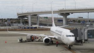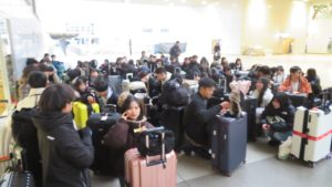 関西空港では41番搭乗口に予定通り集合しましたが、前日からの大雪の影響で新千歳空港が非常に混雑しているため出発が3時間ほど遅れることになりました。JALのスタッフからパンとジュースを貰って待機します。