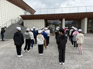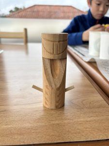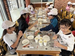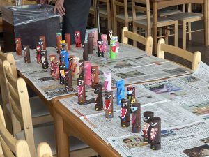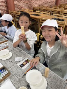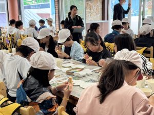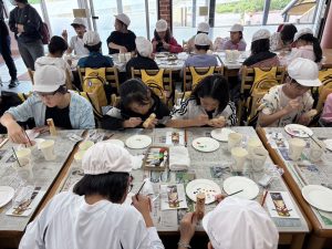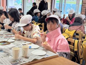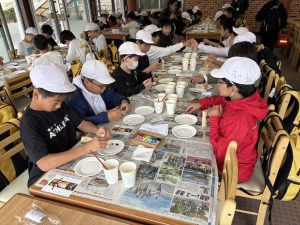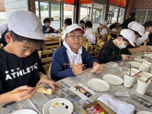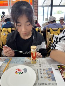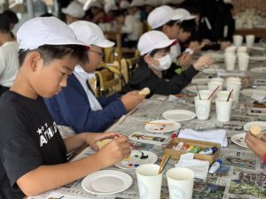 蒜山地方に伝わる妖怪スイトンの絵付け体験や、隈研吾さんが設計されたパビリオン風の葉も見学しました。