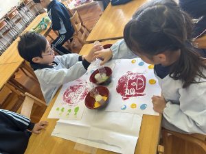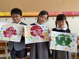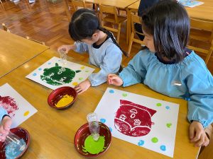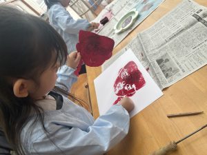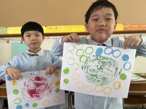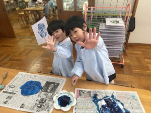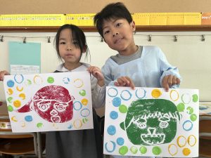 インクをつけて刷り上げると、紙に写った自分の顔を見て、「○○ちゃんに にてる!」と、嬉しそうに話す子どもたちの姿がありました。