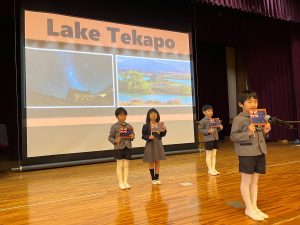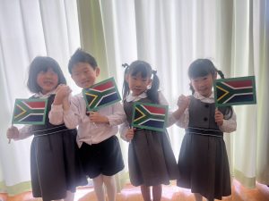 年長組の発表会では『世界の国』をテーマに5つの大陸の中から自分で選び、さらにその中で発表したい国を1人1人が決めて取り組みました。