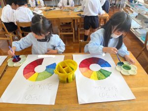 年長組の子どもたちは、絵画製作で〈色の3原色(あか・あお・きいろ)〉を使用し、たくさんの色づくりを楽しみました。