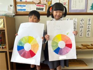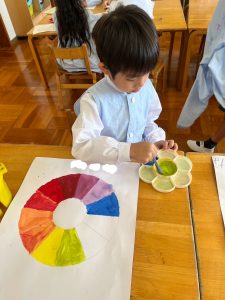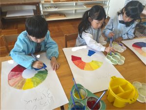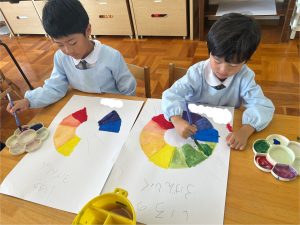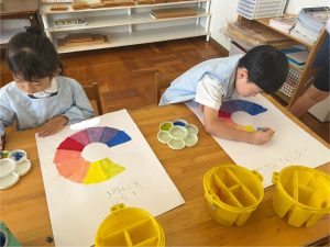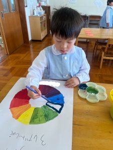 年長組の子どもたちは、絵画製作で〈色の3原色(あか・あお・きいろ)〉を使用し、たくさんの色づくりを楽しみました。