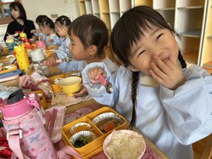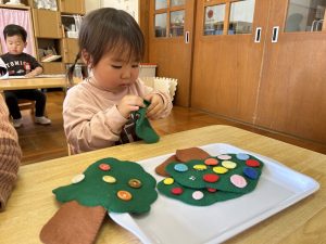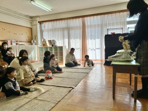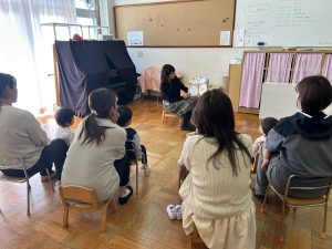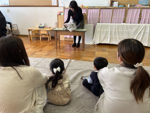 エプロンシアターでは“おおきなかぶ”を行い、「うんとこしょ、どっこいしょ!」と一緒にかぶを引っ張ってくれ、かぶが抜けた時には「やったー!」とみんなで喜びを分かち合いました♡