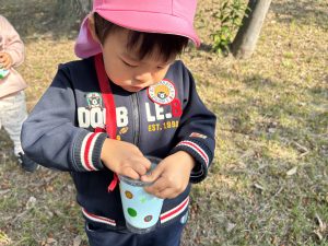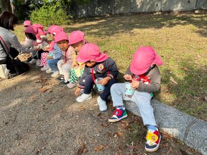 めばえ組では、運動遊びとどんぐり拾いに行きました運動遊びでは、天気も良かったのでしっぽ取りや遊具で遊びました♡鉄棒や大型遊具で目一杯楽しむ姿が見られました。どんぐり拾いでは、拾ったどんぐりをお友だちと嬉しそうに見せ合いっこする姿が見られました!