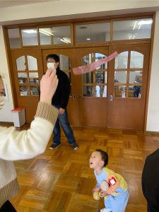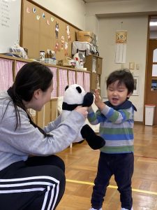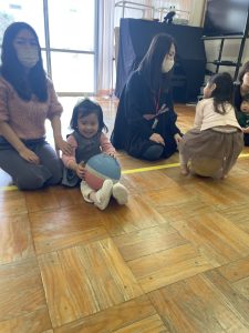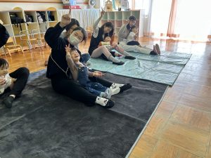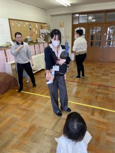 てんしクラブでは、お散歩遊びやふれあい遊び、エプロンシアターを行いました🎵お散歩遊びでは、カエル🐸やとんぼ、ヒヨコ🐣などの色々な生き物に変身してお散歩しました!エプロンシアターでは、「おおきなかぶ」を行い、お母さんと一緒に「うんとこしょ!どっこいしょ!」とかぶを引っ張ることを楽しんでくれる姿が見られました♡