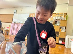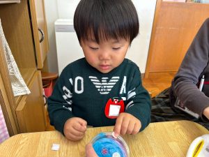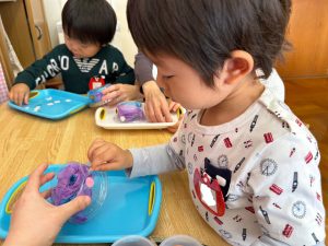 クリーム状の粘土を絞り、どんぐりやリボンなど飾り付けをしました♡ 「ママにあげるー✨」とみんな喜んで作っていました。美味しそうなケーキが完成した時、めばえ組のお友だちたちはとびきりの笑顔に溢れていました♪