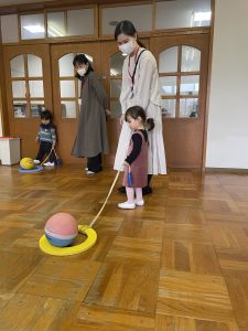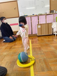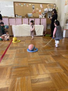 スポンジフープの中にボールを入れ、縄跳びで引っ張る「お散歩」をしました。ボールが外に落ちないようにゆっくりお散歩をして、繰り返していくうちにボールがはみ出さないように上手にお散歩ができていました♡