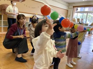 色とりどりのボールの雨に「わー✨」「あめだー!」と大喜びする姿が見られました。最後にはボールをカゴに入れてお片付けもみんなでしました♡
