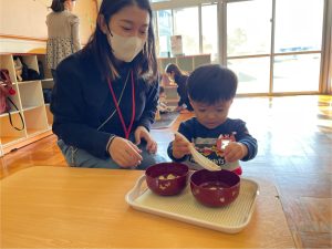 最初は難しかったお友だちも、だんだんリズムよく手を合わせることができました✨最後は前に出て、教師と一緒にお手本を見せてくれるお友だちの姿も見られました😊