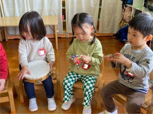 自分がやりたい楽器を選び、教師の合図に合わせて音を出しました。大きな音がでるとみんな嬉しそうに音を出す姿が見られました😊♫
