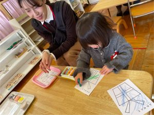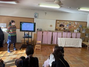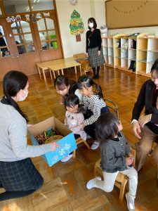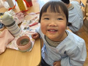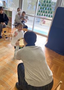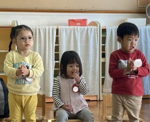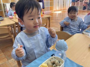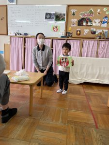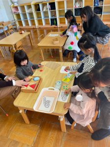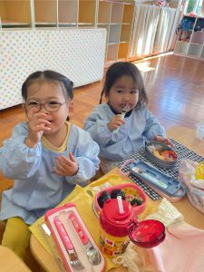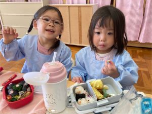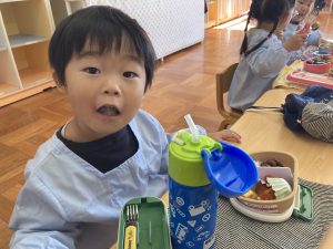 獅子舞の着物は、絵の具スタンプで模様をつけていきした😊この日の昼食はお家から持参のお弁当✨うれしくて、「いただきます」のお祈りをする前に蓋を開けるかわいいフライングもありました♡みんなで楽しい昼食となりました☆保護者の皆様、ご協力ありがとうございました。3期もめばえ組さんと一緒に気持ちに寄り添いながら過ごしていきたいと思います。