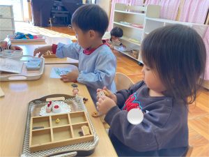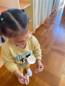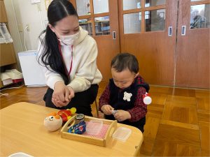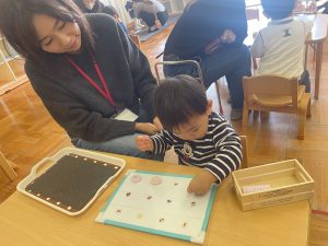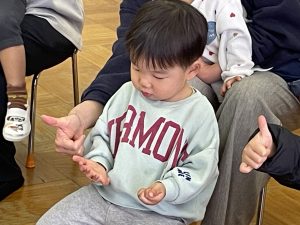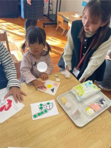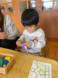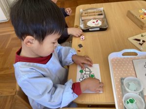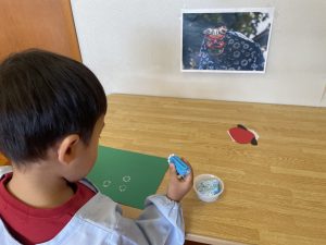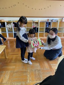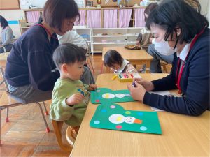 つぼみ組さんではカレンダー製作「だるま」を保護者の方と作りました✨だるまのまゆげは鶴を髭は亀を表していて、「来年も幸せな一年にになりますように」と願いが込められていることを知りました。指先を上手に使いながら糊を手に取り、まゆげやひげを付けていました😊