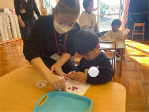つぼみ組では、モンテッソーリ教育のお仕事のひとつ“のりはり“のお仕事を教師がするのを見てから、ブーツ作りの製作をしました。のりの感触が気持ちいいな✨、不思議だな✨と思うお友だちや「ベタベタしているな。。これはなんだろう!?」と指を見つめるお友だちもいました😊保護者の方と話しながら、雪の色を貼っていき世界で一つだけの素敵なブーツが出来上がりました♡