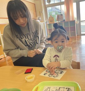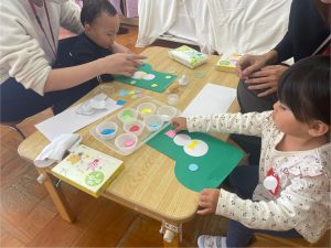 てんしクラブでは、クリスマスのブーツを作りました✨5色のハンコを使ってブーツに模様を付けていきました。スタンプをすることが楽しくて「もう1こするー!」というお友だちもいました☺英語では、クリスマスソングをみんなで歌い、クリスマスカードをお部屋の中で探したり、みんなで楽しく過ごしました。