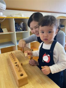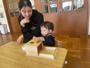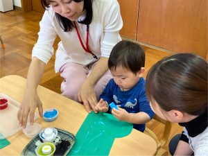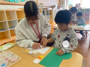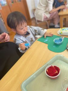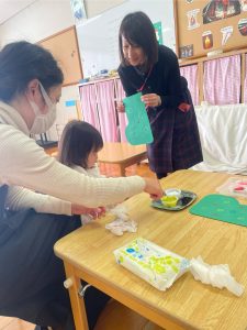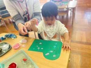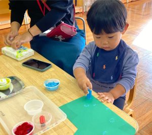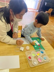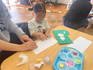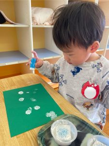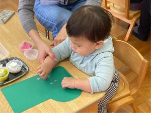 つぼみ組では、モンテッソーリ教育のお仕事のひとつ“のりはり“のお仕事を教師がするのを見てから、ブーツ作りの製作をしました。のりの感触が気持ちいいな✨、不思議だな✨と思うお友だちや「ベタベタしているな。。これはなんだろう!?」と指を見つめるお友だちもいました😊保護者の方と話しながら、雪の色を貼っていき世界で一つだけの素敵なブーツが出来上がりました♡