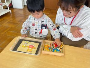 めばえ組のお友だちは元気に登園しています✨かばんの整理やスモックを着る際、手が上手く出せない時でも「自分でする!」「自分でしたい!」という気持ちを伝えてくれ、最後まで頑張る姿が見られます♡お仕事をする時も椅子の座り方も上手になり、好きなお仕事を繰り返し取り組む姿も見られます😊