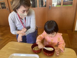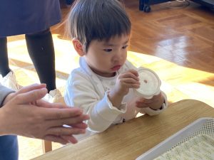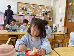 おつけものデーでは、“もう一人のお友だち“への優しい気持ちも育ってきています。おうちの方が作ってくださったおにぎりをみんなとても喜んで食べていました😊🍙