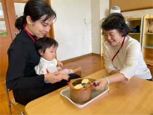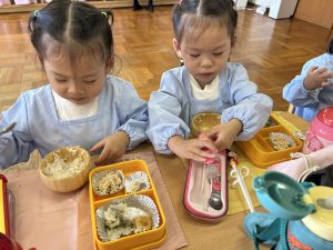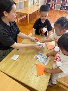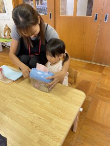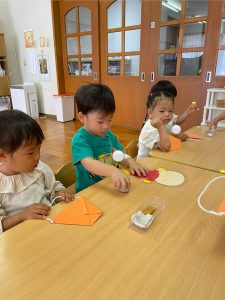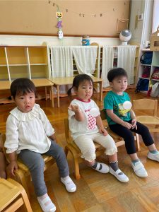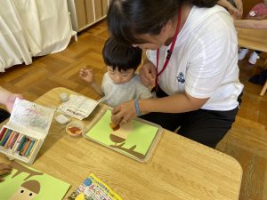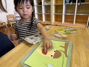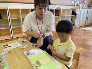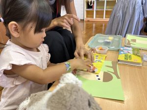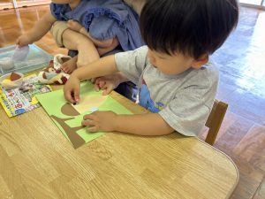 つぼみ組では、11月のカレンダー製作「みのむし」をしました。画用紙の葉っぱをのりで貼って、みのむしのお部屋を作りました。のりの使い方を聞き、みんな正しくのりを使うことができました。英語では、「ハロウィンシャーク」の歌に興味津々でした✨