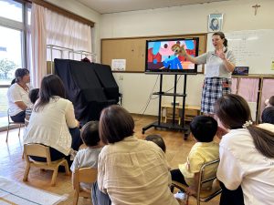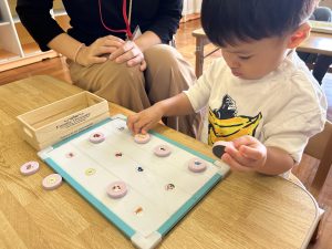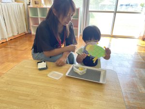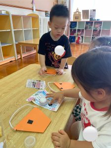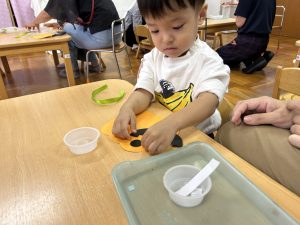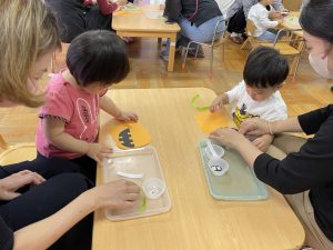 指先を上手に使い、目や口を貼ることができました✨英語では「The Wheels on the Bus」の曲に合わせ運転手さんになって楽しく踊っていました!