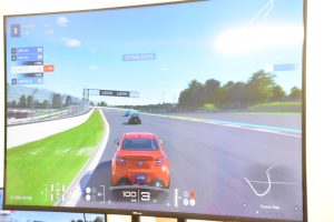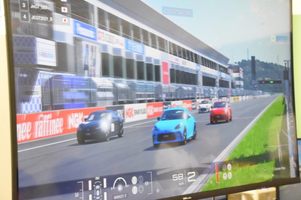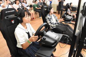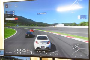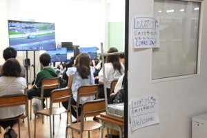 秋麗祭でのeスポーツ体験では、実在するサーキット「富士スピードウェイ」ショートコースを2周するレース形式で行われました。