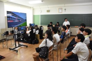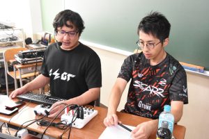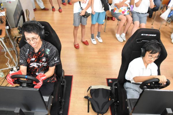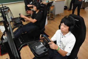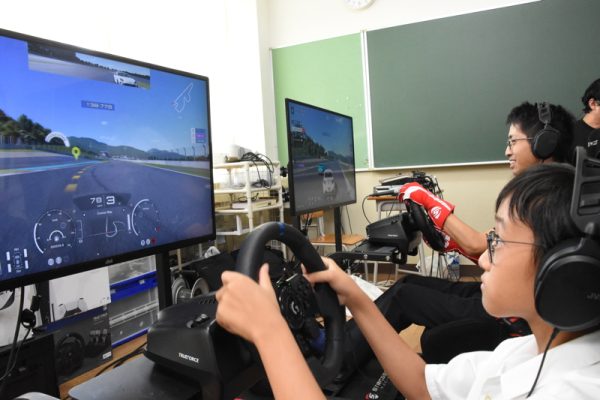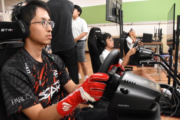 また、実際のJEGTの大会開催時に実況を担当されている方と共に、解説としてJEGTにも参戦されているプロeスポーツレーシングドライバーである山本秀弥選手も賢明学院に駆けつけてくださいました。