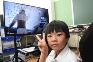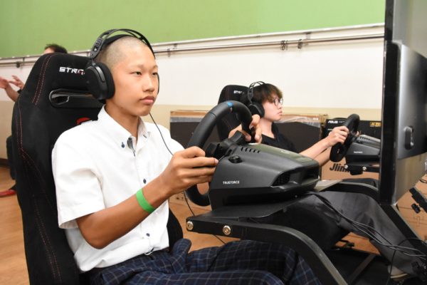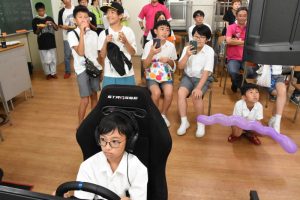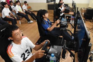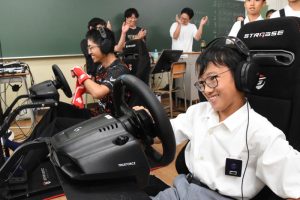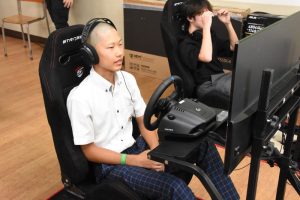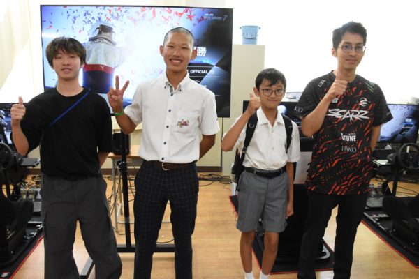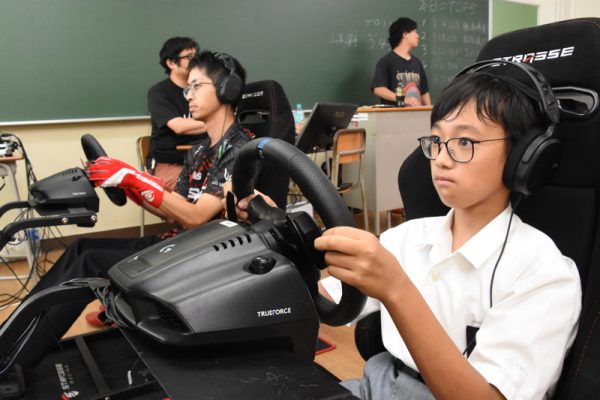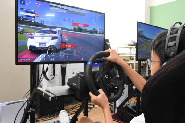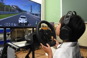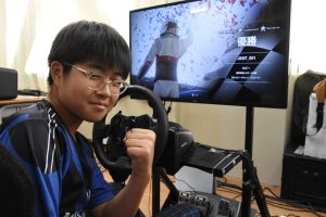 小学生にしてランキング1位を奪取!彼はグランツーリスモ経験者であり、家でも写真のようなハンドルコントローラーで日々腕を磨いている猛者です。経験値なら賢明学院随一かも知れません。たくさんの応援団と共にレースに臨みます。
