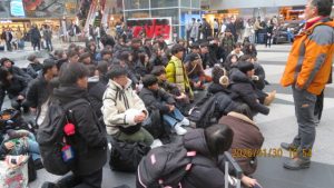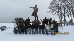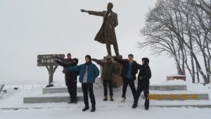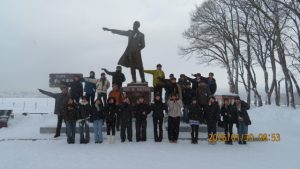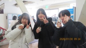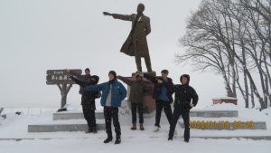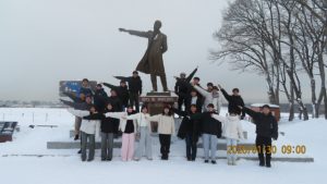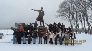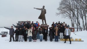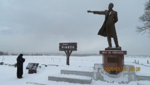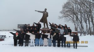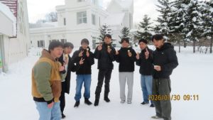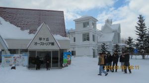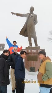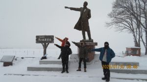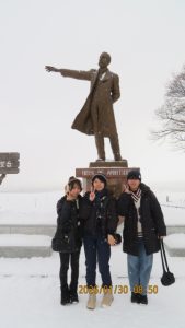 羊ヶ丘公園は一面真っ白な平原でした。クラーク博士像の前でクラス写真を撮影しました。